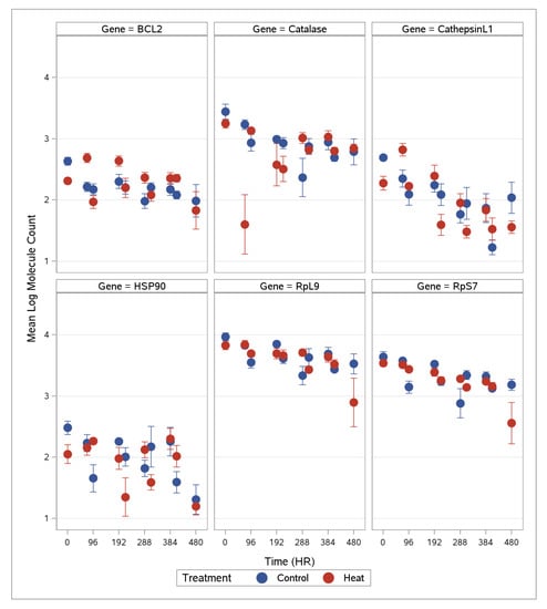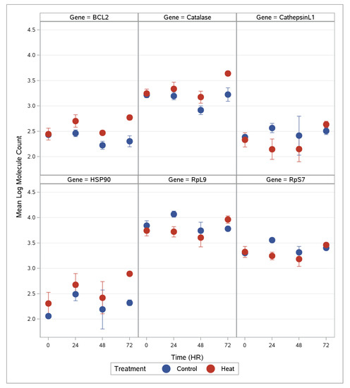 Gene expression of B-cell lymphoma 2 apoptosis regulator (BCL-2), Catalase, CathepsinL1, heat shock protein 90 (HSP90), ribosomal protein L9 (RpL9), and ribosomal protein S7 (RpS7) sampled every 24 h over acute (72 h) time period show mean log molecule count by hour and treatment. Control temperature (