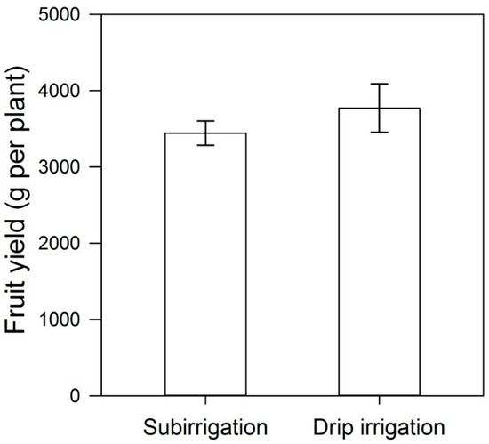 In the present study, tomato fruit production was decreased in subirrigated plants; however, the effect was only marginal as drip-irrigated plants had a yield only 9.5% higher. This suggests that the benefits of subirrigation can be valuable, because with such an irrigation system there was a higher water and fertilizer use efficiency with minimal impact on fruit yield. Our results showed that water use efficiency was 22 L of nutrient solution required to produce 1 kg of fresh tomato fruit in subirrigated plants. In contrast, drip-irrigated plants demanded 86% more water. In terms of total water consumed by plants, water use efficiency in subirrigation was 76 L per plant, while drip-irrigated plants demanded 103% more water. The lower water use efficiency in drip irrigation may be associated with the nutrient solution that leaches at every irrigation event, the more frequent irrigation events required and the higher amounts of nutrient solution required at every irrigation event to saturate the substrate. Garcia-Santiago et al. [39] reported that in subirrigated tomatoes, the substrate had higher total water, easily available water and non-easily available water than in the substrate of drip-irrigated plants at the end of the growing season, resulting in a higher water retention capacity and thus less irrigation events being required than in drip irrigation.