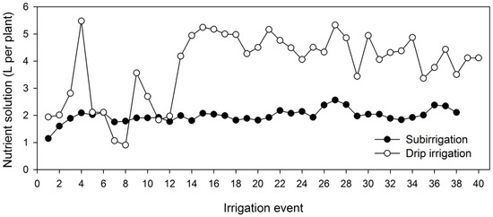 The amount of nutrient solution required to restore evapotranspirated water was predominantly lower in subirrigation in most of the irrigations conducted throughout the experiment, while in drip irrigation, plants demanded twice as much solution (Figure 2). Throughout the study, plants in subirrigation required 38 irrigations whereas in drip irrigation there were 40 irrigation events (Figure 2).