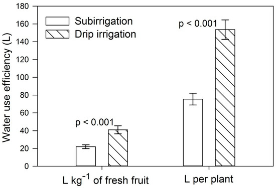 Water use efficiency was higher with subirrigation as plants demanded 22 L of water to produce 1 kg of fresh tomato fruit (Figure 3). In contrast, with drip irrigation, plants required 41 L per kg (Figure 3). In terms of total water consumed, water use efficiency was also higher with subirrigation as plants demanded 76 L per plant, while with drip irrigation, plants demanded 154 L per plant (Figure 3).