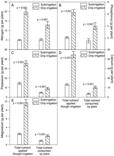 The amounts of N, P, K, Ca and Mg applied through the nutrient solution during the whole experiment were markedly decreased in the subirrigation system (Figure 4). Total N applied was 75% lower in subirrigation than in drip irrigation (Figure 4a), while the P, K, Ca and Mg applied decreased by 66%, 59%, 70% and 74%, respectively (Figure 4b–e). Nonetheless, N accumulated in plant tissues at experiment termination was 60% lower in subirrigated plants (Figure 4a), while P, K, Ca and Mg accumulation was 61%, 47%, 66% and 56% lower, respectively (Figure 4b–e).