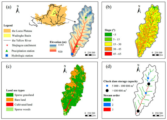 Figure 1. Information of the Shejiagou catchment: (a) location and Digital Elevation Model (DEM); (b) slope distribution; (c) land use types; (d) stream network classification and check dam distribution.