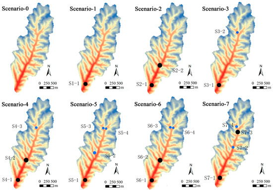 Figure 2. Check dam systems under different deployment strategies. Note that scenario-7 is the current deployment strategy of Shejiagou catchment.
