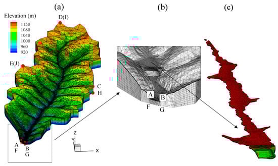 Two subsurface boundary conditions were assigned to each 3D mesh: (1) impermeable for each lateral face and the bottom face (A-E-D-C-B and F-J-I-H-G in Figure 3a); and (2) a local sink (i.e., head-dependent flux) at the down-gradient face [47], subsurface flowing out through A-B-G-F in Figure 3b. The surface boundary conditions were driven by the given precipitation to the whole catchment and constrained by a critical water depth boundary condition (no dam at the outlet, so the critical water depth = 0 m) at the catchment outlet (A–B in Figure 3b). A one-hour uniform rainfall with an intensity of 90 mm hr−1 was chosen to conduct the rainfall-runoff simulations in this study because this rainfall intensity was common in the Shejiagou catchment to induce floods, according to the 31 recorded rainfall-runoff events during 1959–1969. The evapotranspiration process was not considered in these storm event simulations.