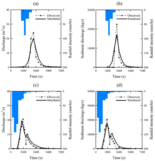 Figure 4. Hydrographs and sedigraphs of the model calibration ((a) and (b), event of 14 July 1964) and validation ((c) and (d), event of 2 August 1964). Note that the blue bars represent the rainfall intensity.
