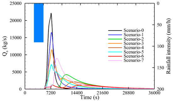 The changes of sediment transport processes at the catchment outlet were generally consistent with the variation characteristics of flood processes under different deployment strategies (see Figure 5 and Figure 6). Along with the reduction and delay in flood peaks, the sediment discharge peaks (i.e., Qs,p) were also reduced and delayed. The efficiencies of Qs,p reduction under the 7 deployment strategies were scenario-6 > scenario-4 > scenario-2 > scenario-5 > scenario-7 > scenario-3 > scenario-1 (Table 6). This result highlighted the importance of adding a large check dam on the middle reach because there was a large check dam on the middle reach of the catchment in scenarios 6,4,2 and no large check dam on the same position in scenarios 5,7,3,1 (see Figure 2). Differently, the reduction rate of Qs,p in scenario-5 (i.e., 67.43%) was larger than that in scenario-7 (i.e., 59.02%), while the reduction rate of Qp in scenario-5 (i.e., 69.12%) was slightly smaller than that in scenario-7 (i.e., 71.45%). This was because that the gully controlled by check dam S5-2 contributed a large amount of eroded sediment into the main channel (see Figure 6 in [22]), and there was no check dam on the heavily eroded gully in scenario-7, indicating that targeted treatment to heavily eroded gullies could lead to a better performance of the check dam system in sediment reduction.