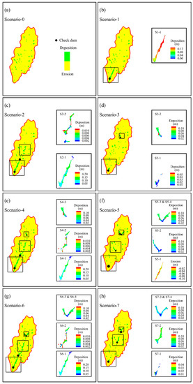 The final distributions of erosion and deposition areas under the eight scenarios were shown in Figure 7. When there was no check dam in the catchment (i.e., scenario-0), erosion processes occurred both on hillslopes and in channels, while deposition areas were sparsely scattered in gully-head areas (Figure 7a). However, the existence of check dams, even when they were filled, could transform a large area of channels and gullies into deposition sinks (Figure 7b–h). By comparing the deposition depths behind each check dam (i.e., in the sedimentary land), we found that more sediment was deposited on the upstream sedimentary lands (i.e., the tail-end areas of the sedimentary land) than on the areas that were close to the check dams (e.g., Figure 7b). This deposition pattern was different from that of an unfilled check dam. For an unfilled check dam, flood processes were stopped at the near-dam area, and consequently, deposition processes occurred there. Therefore, the thickness of the deposition layer was thicker at the near-dam area than at the upstream area [55]. For a filled check dam with a large and flat sedimentary land, which was considered in this study, flood processes were weakened as soon as the surface flow entered the tail-end areas of sedimentary lands due to the decrease of slope gradient [21], consequently promoting sediment to deposit on these areas.