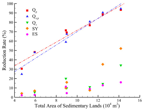 Figure 8. Relationship of the total area of sedimentary lands and reduction rate of flood processes and sediment transport processes.