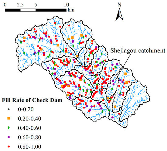 Figure 9. Fill rate of check dams in the Chabagou watershed. Note that when the check dam is filled, its fill rate equals to 1.
