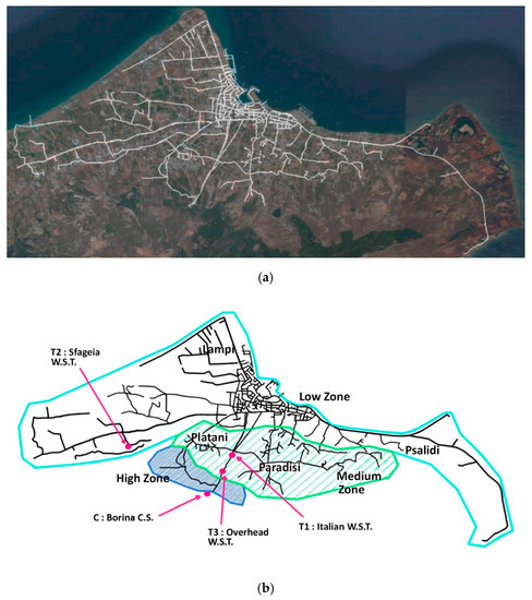 Kos town WDN was chosen as a case study not only for its particular topographical characteristics but due to the fact that it is quite old and the intensity of its use varies a lot throughout the year, mainly between its winter low and its summer peak [35,36,38]. The above characteristics demand the pressure control to be optimized in order to control water losses and maximize the available System Input Volume (SIV) for the summer’s peak water demand [38].