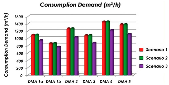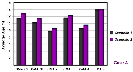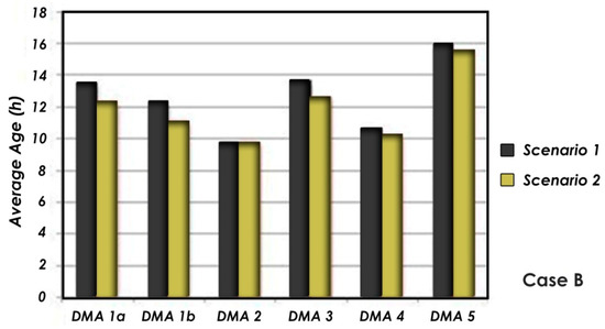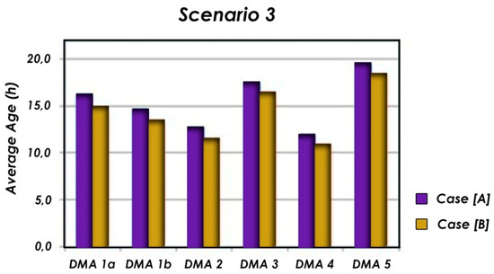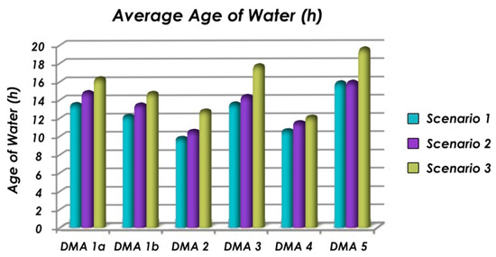 The period of analysis for each simulation (i.e., each one of the three scenarios mentioned above) was equal to 48 h, as each scenario provided enough data to reach safe conclusions. The first thing to be checked was how critical the situation became in every DMA in terms of WA growth. Initially, the DMAs that were formed based on the already developed PM scenarios [35,36], were selected (Figure 2). Each one of these DMAs was formed based on the optimal pressure achieved in its critical node (i.e., the one with the lowest pressure, that is usually the most distant one from the DMA’s entrance). For each scenario, the critical node (marked blue) per DMA, in terms of its WA, was identified (Table 1, Table 2 and Table 3; Figure 3, Figure 4 and Figure 5). Comparing the results of the three scenarios simulated, it was found that the critical nodes (WA-based) were not always the same for each DMA. In Scenario No3 (with DMAs_with PRVs), a remarkable reduction in the mean pressure inside each DMA was achieved, which, on the one hand, was the desired goal but, on the other hand, WA grew. In DMAs 1a,b, 2 and 3, the water-age-based critical nodes (J-139, 130347, 2515 and J-53, respectively, in scenario 1) are not the same for all three scenarios. It must be noticed that the critical nodes identified based on the water pressure (marked red) differ from those identified based on the water age (marked blue). Although Scenario No2 (with DMAs_no PRVs) did not result in a significant water age growth, things were different for Scenario No3 (with DMAs_with PRVs). More specifically, in Scenario No2, the mean pressure was not reduced a lot, the water age was slightly increased, the SIV was not significantly altered and the number of dead ends was increased by only seven. On the other hand, in Scenario No3, water age was significantly increased (as expected) as the water pressure was highly reduced, resulting in a significant reduction in both the actual water demand and the water losses (pressure-dependent). Thus, water inside the network pipes was not adequately refreshed. The installation of PRVs offers an efficient management of the WDN as the pressure is being effectively managed (gets down to 200 kPa in the critical nodes meeting the threshold set by the Greek legislation) [39] and is ideal for the proper operation of the WDN and reduction in losses. However, nodes with very low pressures are considered critical and undesirable. Table 4 and Figure 6 and Figure 7 present the water age (hours) per DMA and the total water demand (m3) for all three scenarios and a 48-h analysis.