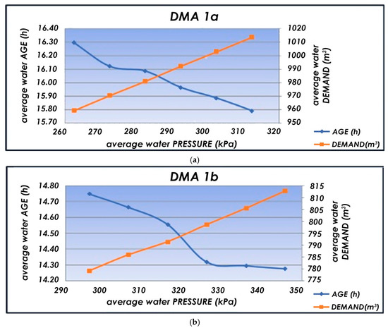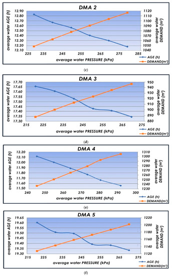 WA is proven to grow as pressure is reduced, resulting in a decreased System Input Volume (SIV), so the hydraulic model is approached differently. Therefore, trials were set to strike a balance between the reduction in the pressure (even if it does not reach the ultimate optimum level) and the increase in the water age. For each DMA, the downstream pressures of the PRVs (Scenario No3) have been modeled to lower the pressure at every node as close to 200 kPa as possible (Table 5). These values of the downstream pressures after the PRVs, are set in a certain inclining pattern using a 10 kPa step, thus forming six new cases (a–f) (Table 5). In this way, the reaction of the water age was monitored for every pressure level increased by 10, 20, 30, 40, 50 kPa, respectively, compared to the initial values of the PRVs’ downstream pressure. Each time the pressure increases, the same happens with the SIV, while the WA seems to decrease. Figure 8 presents the trends of the average water age and pressure, defining the balancing point for each DMA and for each one of the six new cases (a–f).