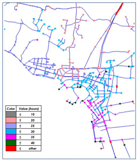 Water Age (WA), a parameter widely used in the hydraulic analysis of a WDN model, measures (represents) the time the water needs to reach each junction (node) of model (network) starting from the water tank, considering that the node is where the actual water consumption takes place. Depending on the level of demand and losses (both are pressure dependent) allocated at each node, WA also integrates the time the water “waits” to be consumed. WA is a well-recognized indicator of the quality of the water flowing inside the WDN. As the WA grows, the quality of the supplied water deteriorates, a statement presented by other researchers as well [32]. Although the WA is indirectly assessed through the WDN’s hydraulic model [23,34], it is proven that, as water travels through the pipes, it undergoes various chemical transformations, negatively affecting its quality. Several of these transformations depend on the velocity of the water flow, the pipes’ material in combination with the “aggressiveness’ of the water (i.e., low PH), the substances being carried along with the water, etc. Nodes reach their age depending on the flow of water through them but also depending on the age of the water reaching them. Finally, WA grows bigger as water stays inside the reservoirs/water tanks or travels through the water aqueducts.
