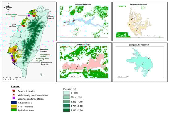 The Wushantou Reservoir is located in Tainan City. This reservoir is surrounded by residential and agriculture areas (Figure 1). The Wushantou Reservoir has a volume of 78,280,000 m3 and supplies 350,000 m3/day. 59% of the catchment area is forest, 19% accounts for orchards, while the reservoir and water systems account for approximately 17% and the remaining 5% are wasteland, buildings and grassland.