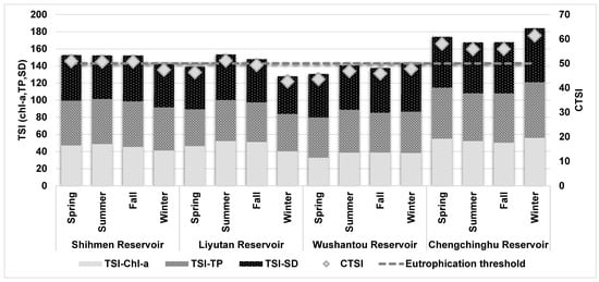 The CTSI is defined as the total weight of living biologic material (biomass) in a waterbody at a specific location and time. The CTSI uses algal biomass as the basis of trophic state classification []. Three variables, including Chl-a, SD and TP level, are used to estimate the algal biomass. The CTSI can be determined by calculating the average of trophic state index (TSI) of each indicator from three interrelated factors in accordance to Taiwan EPA regulations []: