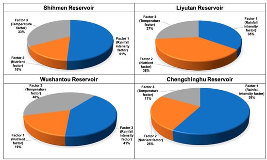 In the Liyutan Reservoir, the first components was mainly governed by pH and total precipitation, which suggests that it describes the precipitation or rainfall intensity as a governing factor. The second components is mainly loaded by SD, Chl-a, TP, COD and ammonia, which are mainly governed by irrigation and other agricultural activities. The air and water temperature also influenced the water quality in the Liyutan Reservoir, as shown in the third component. In the Wushantou Reservoir, nutrients and temperature were the main factors governing the first and second components, respectively; and the third factor was driven by rainfall intensity. Rainfall intensity was the major explanatory parameter for the variation in this reservoir (Table 4). In the Chengchinghu Reservoir, the first factor was mainly governed by rainfall, the second factor represents the nutrient factor, and the third factor was governed by temperature. The first factor was the highest contributor in the Chengchinghu Reservoir (Table 4).