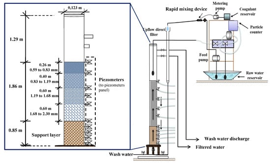 The upflow direct filtration experiments were conducted in a pilot plant. The upflow pilot filter had a total height of 4.0 m with sand medium depth of 1.86 m over a 0.85 m support layer. The sand medium consisted of four sub-layers with the granulometric characteristics proposed by Sens et al. [] (Figure 1).