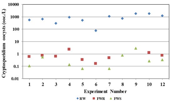 Cryptosporidium oocysts in raw and filtered water (RW—Raw Water; FWR—filtered water during ripening; FWS—filtered water during stable operation).