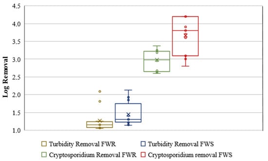 Data on particle counts, turbidity, and Cryptosporidium oocysts levels in raw and filtered water were recorded during the filtration experiments and treated to obtain their descriptive statistics, mainly the average and standard deviation. Non-parametric statistical techniques were applied to determine the existence of statistically significant correlations between the parameters and the removals in log units. Spearman’s non-parametric correlation test was applied with variation between −1 and 1 using Version 9.0 of the Statistica StatSoft software. Non-parametric statistics represent a set of techniques most appropriate for use in studies where the distribution of a population and its parameters are not well known. Box-whisker plots of log removals were also produced.