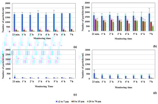 Average particle count: (a,c) raw water and filtered water, respectively, in experiments with low turbidity raw water; (b,d) raw water and filtered water, respectively, in experiments with higher turbidity raw water. Error bars represent the standard deviation from average particle count.