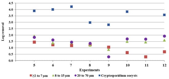 In all experiments shown in Figure 5 the oocysts removals were considerably higher than particle removals. In experiments E5 to E12, on average, oocysts removal (3.6 log) was at least 2.1 higher than particles log removals for the size ranges 2–7, 8–15, and 20–70 µm (0.92, 1.42, and 1.49 log, respectively). It is also observed that the relationship between both parameters does not seem to be proportional. These observations are consistent with those reported by Edzwald et al. [] and Huck et al. [] in pilot conventional water treatment systems with dual-media filters operated under optimized coagulation conditions. According to Edzwald et al. [], this behavior is most likely due to the differences among the analytical methods used to quantify both parameters, which are influenced by the small portion of oocysts in the raw water as well as the wider variety of particles characteristics such as size, shape and color. Based on the results of both studies, the authors have suggested that, under stable or optimal conditions, particle counts should be considered a conservative indicator of Cryptosporidium oocysts removal along with turbidity removal, as low levels of these parameters can be associated with good operational conditions for removal Cryptosporidium oocysts.