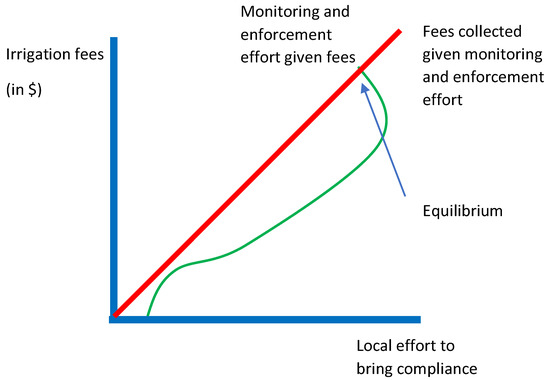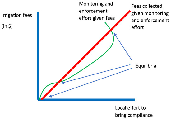 Turning to the fees paid and the monitoring effort, it seems reasonable and parsimonious to assume that the greater the monitoring and enforcement effort, the higher the revenue collected will be and this is depicted with the upward sloping line in Figure 3. The combination of these two functions results in multiple equilibria, some with high compliance, high fee payment and high local enforcement effort and others with low compliance, collection and enforcement effort.