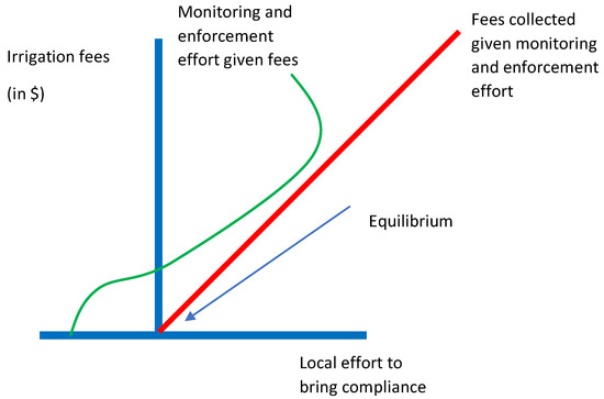 We contrast this with a scenario where a large portion of fees collected from irrigators is retained locally and the perceived legitamcy is greater. In this instance, we hypothesise that the monitoring and enforcement against fees function is displaced rightward (see Figure 5). The upshot is an equilibrium with high payment, compliance and enforcement, analogous to the north-west quadrant in the prisoner’s dilemma in Figure 2.