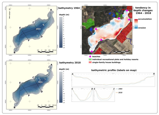 Figure 5. Changes in the bathymetry of Lake Borówno in the years 1964–2018 (prepared on the basis of the data of IRŚ [63,71], and own measurements).