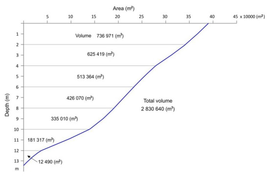 In Lake Borówno, in the period 1964–2018, the water level decreased by 0.94 m (Table 6), the surface area of the lake dropped by 4.74 ha (10.8%) and the volume of the lake reduced by 474.96 × 103 m3 (14.4%). This decrease in depth mainly applies to the south-eastern part of the lake and fragments located along the southern shore (Figure 5). In this zone, the alluvial fan is visible in the lake basin in the mouth section of the tributary, which drains the arable land located south-east of Lake Borówno (Figure 5). Along the northern shore and in the northern part of the basin, the depth increased locally. The current bathygraphic curve of Lake Borówno (Figure 6) shows a slope break at the depths of 4 m, 10 m, and 12 m. The 0–4 m depth zone contains almost 48.1% of the lake’s water volume and the 0–10 m zone holds 93.2% of total water mass (Table 7). The deepest zone, below 10 m, contains only 6.8% of the total water mass of Lake Borówno.
