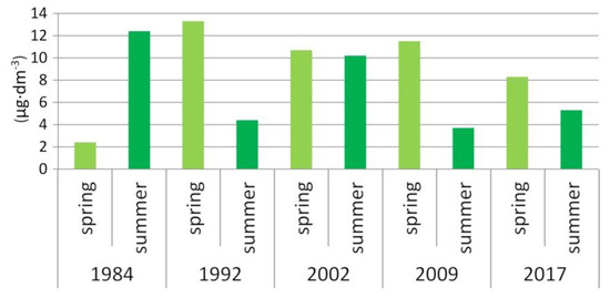 Chlorophyll a displays a typical time distribution in Lake Borówno. The characteristic peak occurs in spring, while in summer, the trophogenic layer shows a lower concentration of this pigment (Figure 9), which is related to the decline of phytoplankton. This is due to the exhaustion of the pool of available biogenic nutrients affecting the growth intensity of algae and cyanobacteria. The concentration of chlorophyll a over the years showed fluctuations from 2.4 µg·dm−3 to 13.3 µg·dm−3, with a higher chlorophyll a content in the summer season compared to spring, except for 1984.