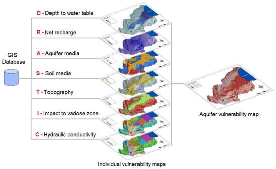 Merchant et al. [52] were the first that used GIS for DRASTIC implementation. Since then, due to their capability of retrieving, storing, organizing, analyzing, and presenting geographically referenced spatial data, GIS methods have been successfully employed for assessing the groundwater vulnerability [53,54,55,56,57,58,59,60].