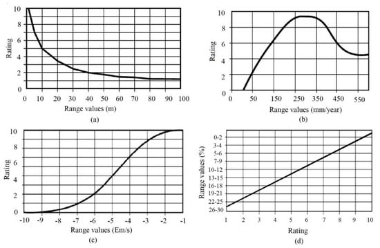 The scores for the D factor are 1, 2, 3, 5, 7, 10, for groundwater depths (m) greater than 30, in the interval (10, 30], between 6 and 10, in the interval (3, 6], in the range 1–3, less than 1, respectively [66].