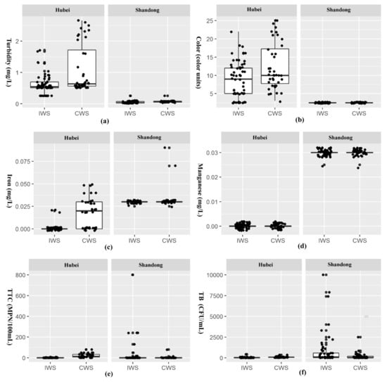 Tap water quality parameters for households using IWS and CWS in Shandong & Hubei (Data source: This study): (a) Turbidity; (b) Color; (c) Iron; (d) Manganese; (e) Thermotolerant Coliforms; (f) Total Bacteria.