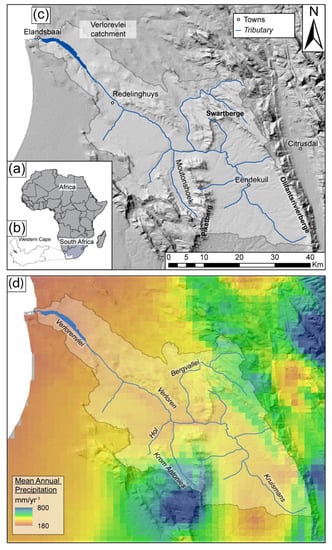 (a) Location of South Africa within Africa; (b) location of Western Cape (WC) within South Africa showing the study catchment; (c) Verlorenvlei catchment with the location of the two main mountain ranges as well as the Moutonshoek valley; and (d) feeding tributaries within the catchment overlain on the distribution of mean annual precipitation derived from [31].