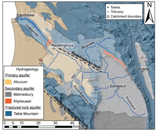 The alluvial aquifer(s) is everywhere underlain by a semiconfined to confined secondary porosity aquifer hosted by the Malmesbury Group (MG), with a partial clay aquitard overlying it [30]. Faults, weathering zones and bedding planes are the primary features that control groundwater flow [30]. The MG aquifer is associated with high-yielding artesian boreholes and good-quality groundwater in places (particularly along the Krom Antonies). The MG aquifer does not show any direct response to precipitation [33]. It is therefore likely that the MG aquifer derives a significant amount of recharge from the TMG aquifer as a result of high hydraulic gradients from the mountains, and groundwater flow following a SE-NW direction, primarily controlled by faults [30,40,41,42].