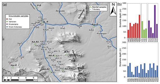 Six groundwater sampling trips took place during 2015 (June, September, November) and 2016 (March, June, November), with 102 samples collected from 41 boreholes across the catchment (Figure 3a). All boreholes were tapping into the MG aquifer. Of the 41 boreholes sampled, the depths of nine boreholes are unknown. The shallowest boreholes occur along the Krom Antonies, ranging between 21 and 122 metres in depth, with only 6 of the 17 recorded depths being greater than 100 metres (Figure 3b). The deepest borehole sampled in this study occurs along the Kruismans at Krs4 (Figure 3b), with a depth of 285 metres, and could possibly be tapping into a deeper aquifer. Along the Hol tributary, borehole depths range between 70 and 200 m, with the deepest borehole (200 m) occurring at the confluence (Hol8). The three boreholes situated after the confluence in the Verloren range in depth from 70 to 145 m. Not all boreholes were able to be sampled every field trip due to logistical difficulties associated with the drought. No samples were collected from the Bergvallei tributary because of a lack of suitable boreholes to sample from.