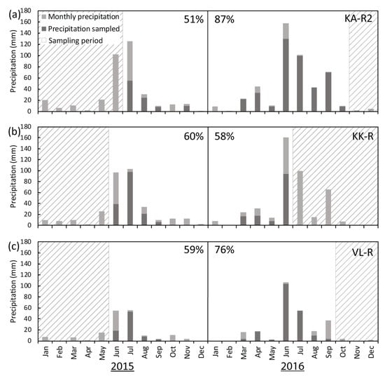 Monthly precipitation values at (a) KA-R2, (b) KK-R and (c) VL-R showing the proportion of precipitation sampled on a monthly basis at the three daily rainfall collectors. Hatching represents the period during which precipitation was not collected.