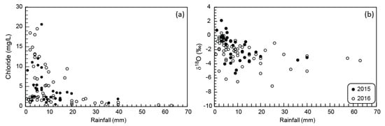 Relationship between (a) chloride concentration and (b) δ18O ratio and rainfall volumes for the sampling period.