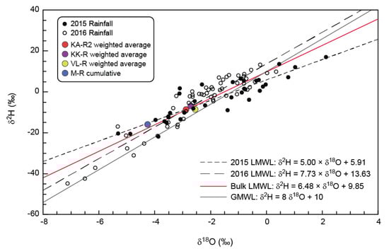 δ18O vs. δ2H plot showing distribution of rainwater samples and slope of local meteoric water lines defined for both 2015 and 2016 as well a combined local meteoric water line. The weighted averages for the rainwater collectors over the sampling period are also shown. LMWL: local meteoric water line; GMWL: global meteoric water line.
