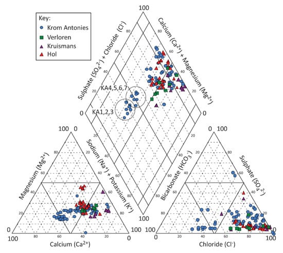 Chloride is the dominant anion in the study area, followed by bicarbonate and sulphate (Figure 7). Statistical outlier Hol2 has an average chloride value of 1790 mg/L (1084–2114, n = 6, Table S4) that far exceeds that from any other sampling site in the field area, and has been omitted from Figure 7 (Table S4). Hol chloride concentrations are similar to those in the other tributaries, and the mean is distorted by Hol2 and Hol6 (Table 2). Chloride concentrations in groundwater follow the same trend as sodium and magnesium, where Hol > Krom Antonies > Confluence > Kruismans. Bicarbonate likewise follows the same trend as calcium, where Krom Antonies > Hol > Verloren > Kruismans. Average sulphate concentrations show a different trend where Krom Antonies > Kruismans > Hol > Confluence. Most sampling sites (except for KA1, KA2 and KA3) fall between a mixture of Na+-Cl− and Ca2+-Mg2+-Cl− type groundwater (Figure 7). Seven boreholes, occurring along the Krom Antonies, plot off the main sample group and represent the boundary between Ca2+-HCO3− type groundwater (KA1, KA2 and KA3), and Ca2+-Mg2+-Cl− type groundwater (KA4, KA5, KA6 and KA7) (Figure 7).