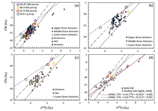 Stable isotope values of groundwater from the Verlorenvlei catchment. (a) Groundwater from all four tributaries examined in this study as well as the weighted average of precipitation from the four precipitation collectors, (b) variation between the upper, middle and lower Krom Antonies, (c) comparison between the Hol and lower Krom Antonies groundwater, and (d) comparison between the groundwater from location Hol6 and shallow groundwater in the alluvial aquifer in the Hol and down to the confluence derived from [38]. LMWLs for 2015 and 2016 as per Figure 6. GMWL (solid grey line) derived from Craig (1961). WA = weighted average, precip = precipitation, GW = groundwater.