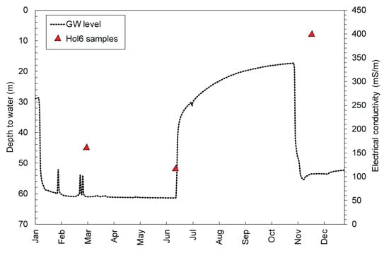 Measured electrical conductivity (EC) and groundwater levels for MG aquifer at location Hol6 for 2016 (after [33]).