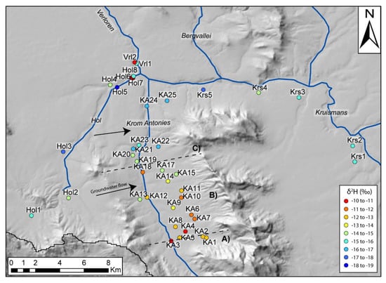 Delineation of groundwater zones along the Krom Antonies based on groundwater 2H, where A is the upper Krom Antonies, B the middle Krom Antonies and C the lower Krom Antonies.