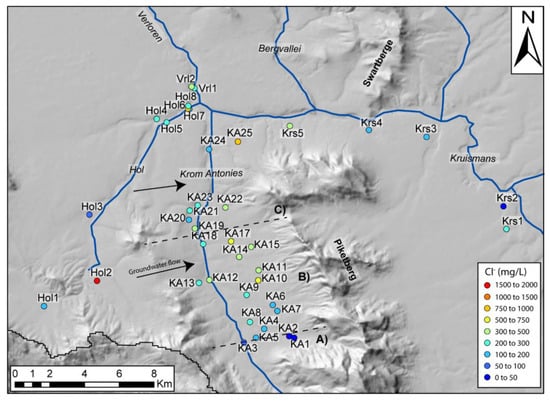 Delineation of groundwater zones along the Krom Antonies based on groundwater chloride concentrations. A, B and C as per Figure 10.
