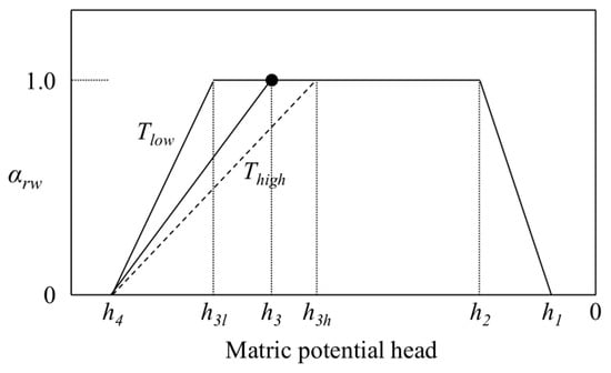 where αrw is the reduction factor for excessive wet and dry conditions (−). The reduction factor αrw changes from 0 to 1.0 depending on the critical pressure heads h1, h2, h3, and h4 (Figure 1). Root water extraction is optimal between h2 and h3; the reduction under wet conditions occurs when wetter than h2; under dry conditions, the reduction occurs when drier than h3. The value of h3 depends on the water demand of the atmosphere and varies with Tp; it is expressed by following equations: