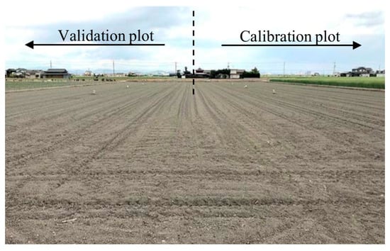 Field observations were conducted in 2018 and 2019 at a converted field (100 × 43 m) in Okayama, Japan (37°34′53.4″ N; 113°54′11.8″ E). The soil in the field was lowland paddy soil according to the Japan soil inventory, NARO (http://soil-inventory.dc.affrc.go.jp/) []. The field was divided into two plots for other research purposes; for our purposes, we defined these as calibration and validation plots (Figure 2 and Figure 3). Rotary tillage was carried out to a depth of 12 cm in both plots before sowing maize for whole crop silage.