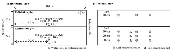 Field data for model calibration were collected in the calibration plot during the 2019 maize growing season. Maize was sown on 10 April 2019, and observations were made between 24 April and 17 July 2019. Groundwater level, as the bottom boundary, was recorded by a water level monitoring sensor (HYDROS 21; METER Group, Pullman, WA, USA) in the center of the field (Figure 3). We could not measure matric potential in our environment (i.e., low budget, labor deficit for sensor maintenance); we measured volumetric water content using capacitive soil moisture sensors (EC-5; METER Group) because they measure value accurately and are inexpensive. The sensors were set up in three locations at depths of 10, 20, and 30 cm (Figure 3). The daily change in volumetric water content for calibration was acquired by averaging the readings of the three soil moisture sensors at each depth. Volumetric water content and groundwater level were recorded every 30 min.