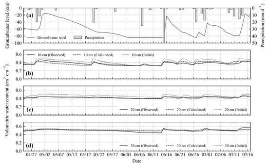 Volumetric water content in the calibration plot in 2019. (a) Groundwater level and precipitation; (b–d) results at depths of 10, 20, and 30 cm, respectively. The maximum daily precipitation, 51.7 mm d−1, occurred on 15 June 2019. The results with initial and calibrated soil hydraulic parameters were generated using the data in Table 4 and Table 5, respectively.
