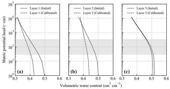 The analytical soil water retention curves generated by initial and calibrated Mualem–van Genuchten parameters. (a–c) Results for layers 1, 2, and 3, respectively. The grey area represents the zero-water-stress zone; drought or wet stresses occur outside this area. In the scenario condition, layers 1 and 2 used the calibrated soil water retention curve of layer 1.