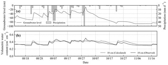The SWAP model with optimized parameters was able to simulate the volumetric water content under significantly different weather conditions. Figure 6a shows the groundwater level and precipitation in the validation plot in 2018; precipitation intensity and groundwater level were higher in 2018 than in 2019 (Figure 4a). Before 29 September 2018, the groundwater level was relatively high, and precipitation occurred frequently. The maximum daily precipitation (82.7 mm d−1) occurred on 29 September 2018. Thereafter, the groundwater level gradually decreased to its lowest value (−90 cm), and precipitation became less frequent. Figure 6b shows the temporal changes in θobs and θcal at a depth of 10 cm: the trends in θcal and θobs were matched; both values changed with the precipitation. The RMSE between θcal and θobs was 0.029 cm3 cm−3. This result indicates that, even with high levels of precipitation and groundwater, the model was able to reproduce actual volumetric water content using our calibrated parameters.